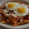Chilaquiles en salsa roja con huevos estrellados gratinado de queso crema y cebolla acompaado de frijoles y pan
